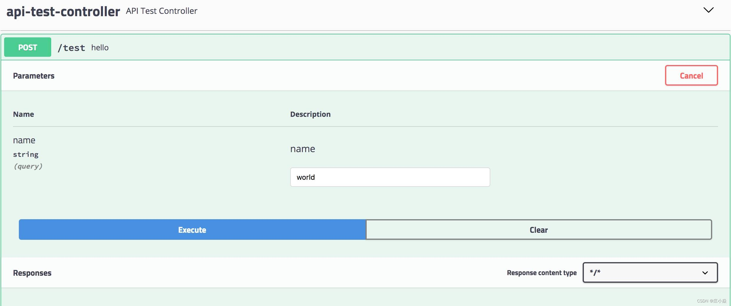 Now it has been integrated Swagger function , open http://localhost:10060/swagger-ui.html, find api-test-controller The corresponding method below , Click on " try it out ", Input parameters , perform " Execute " function . View the normal output results :