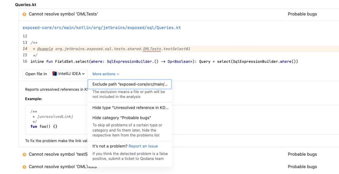 More actions(更多操作)下拉菜单可用于执行各种操作,例如在未来分析中排除某个路径、文件或整个目录,隐藏特定类型或类别,或者报告您认为某段代码被错误标记的情况。