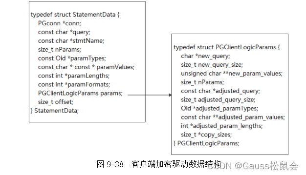 用户执行SQL查询语句时,通过Pqexec函数执行SQL语句,SQL语句在发送之前首先进入run_pre_query函数函数,通过前端解析器解析涉及密态的语法。然后在run_pre_statement函数中通过分类器对语法标签进行识别,进入对应语法的处理逻辑。在不同的处理逻辑函数中,查找出要替换的数据参数,并存储在结构体StatementData中,数据结构如图9-38所示。最后通过replace_raw_values函数重构SQL语句,将其发送给服务端。在PqgetResult函数接收到从服务端返回的数据时,若是加密数据类型,则用deprocess_value函数对加密数据进行解密。接收完数据后还需要在run_post_query函数中刷新相应的缓存。