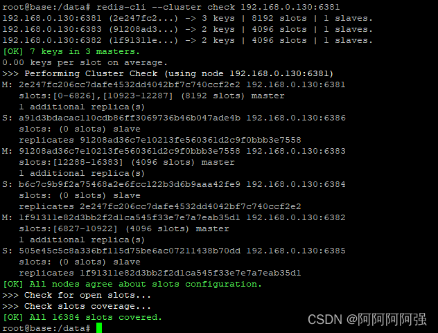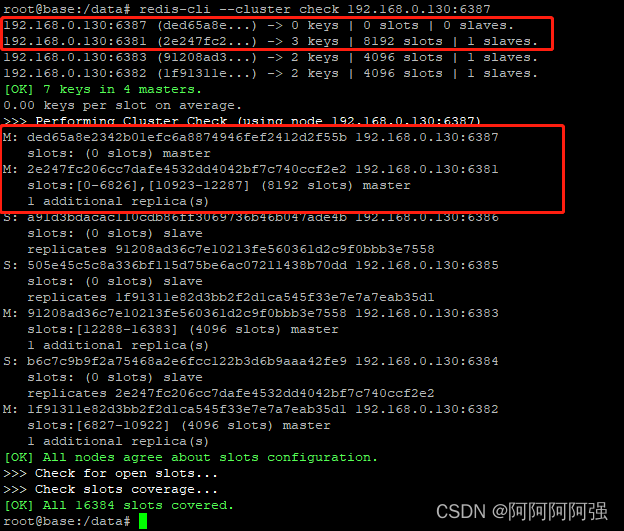 [email protected]:/data# redis-cli --cluster create 192.168.0.130:6381 192.168.0.130:6382 192.168.0.130:6383 192.168.0.130:6384 192.168.0.130:6385 192.168.0.130:6386 --cluster-replicas 1explain :
