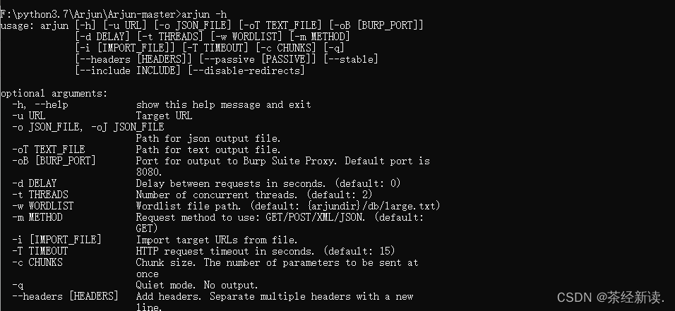 输入arjun -h查看版本,出现如下页面则安装成功: