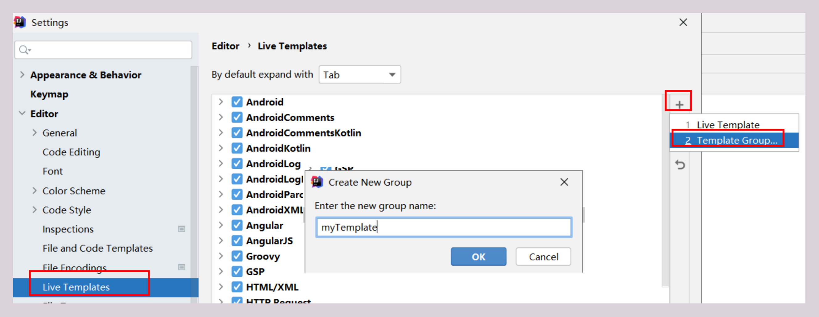 Live Templates → Select the template group myTemplate → + → Live Template → Abbreviation Shortcut key → Template Text Template content → Associative language → apply → ok