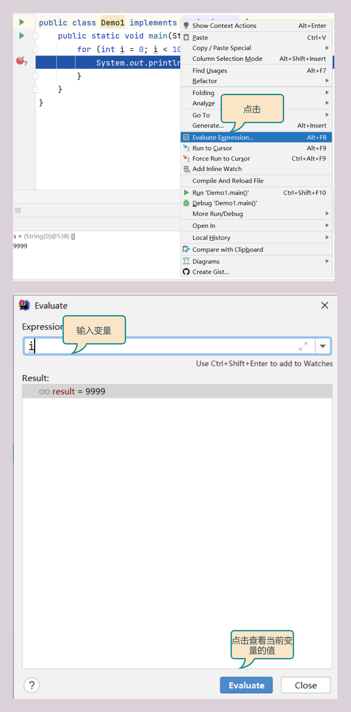 When the breakpoint reaches a certain step , We can right-click Evaluate Expression Execute the view expression , Enter the variable value you want to view in the search box , As shown below :