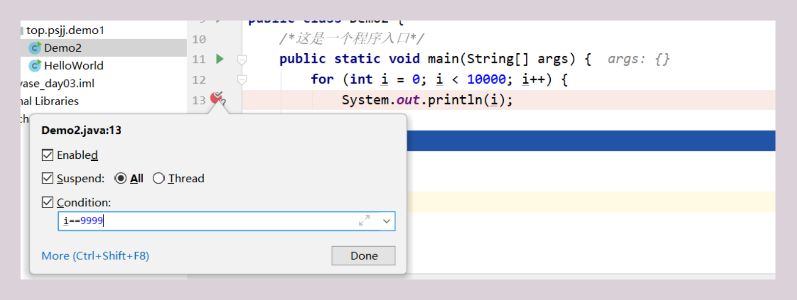 When we test for In the cycle , If you execute 10000 Secondary cycle , Let's just order 1 Ten thousand times next , Not reality , We can right-click the breakpoint and enter the conditional expression , Execute breakpoints under specified conditions .