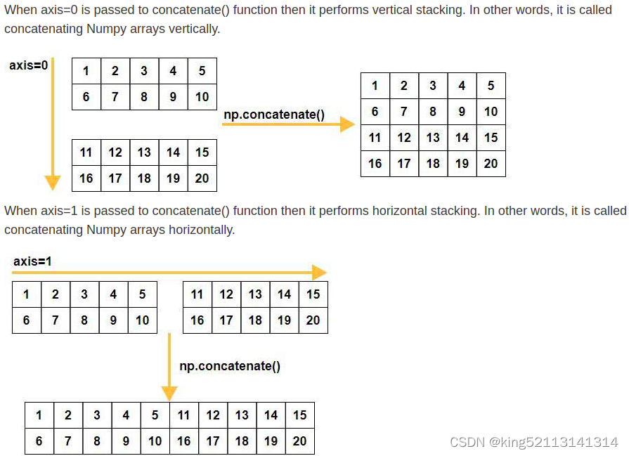 print('Concatenate along axis=0:\n', np.concatenate((a,b), axis=0))