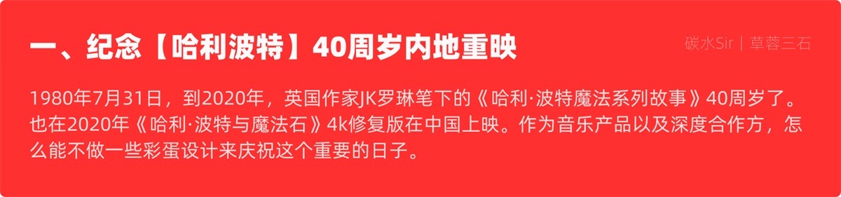 设计目标:通过增加彩蛋,纪念《哈利波特 40 周岁暨电影重映》,提升歌曲二次曝光度。