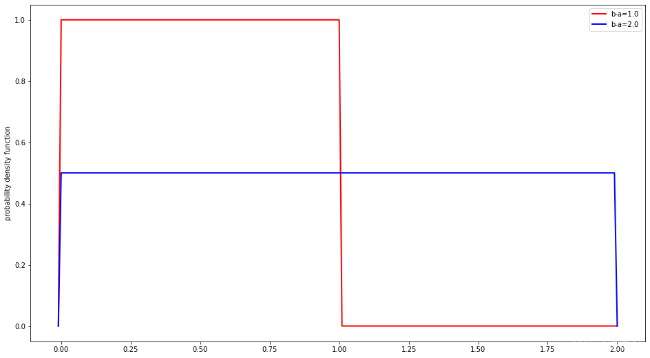 从图中可看出,红色概率密度函数只在0~1才会发生,曲线与x轴的0~1区间所封闭的面积为全概率1.0.