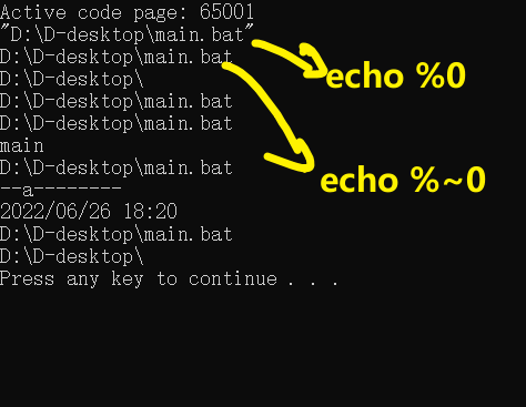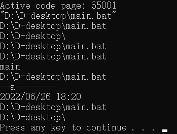 举个例子,demo.bat文件在路径【D:\D-desktop】中。假设执行cmd命令【demo.bat】,那么%0就等于【demo.bat】。而如果是直接双击(也可以是其他非cmd命令执行方式),那么%0就是等于【D:\D-desktop\demo.bat】。