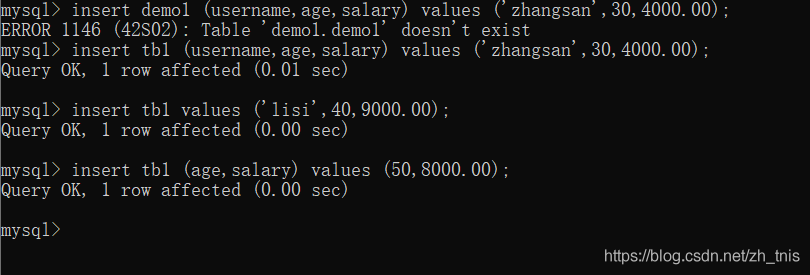 - 3:insert table_name (col_name1,col_name2) values (col_key1,col_key2);