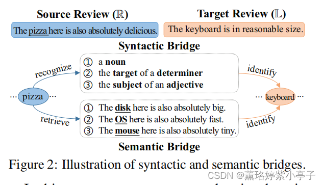 直观地说,如果我们将Pizza与一些原型目标术语联系起来,如{disk、OS、mouse},训练和测试评论之间的领域差异可以大大减少。与以前的观点和基于上下文术语的方法相比,构建一个语义桥直接跨域连接属性词,并且只需要未标记的源数据和目标数据。