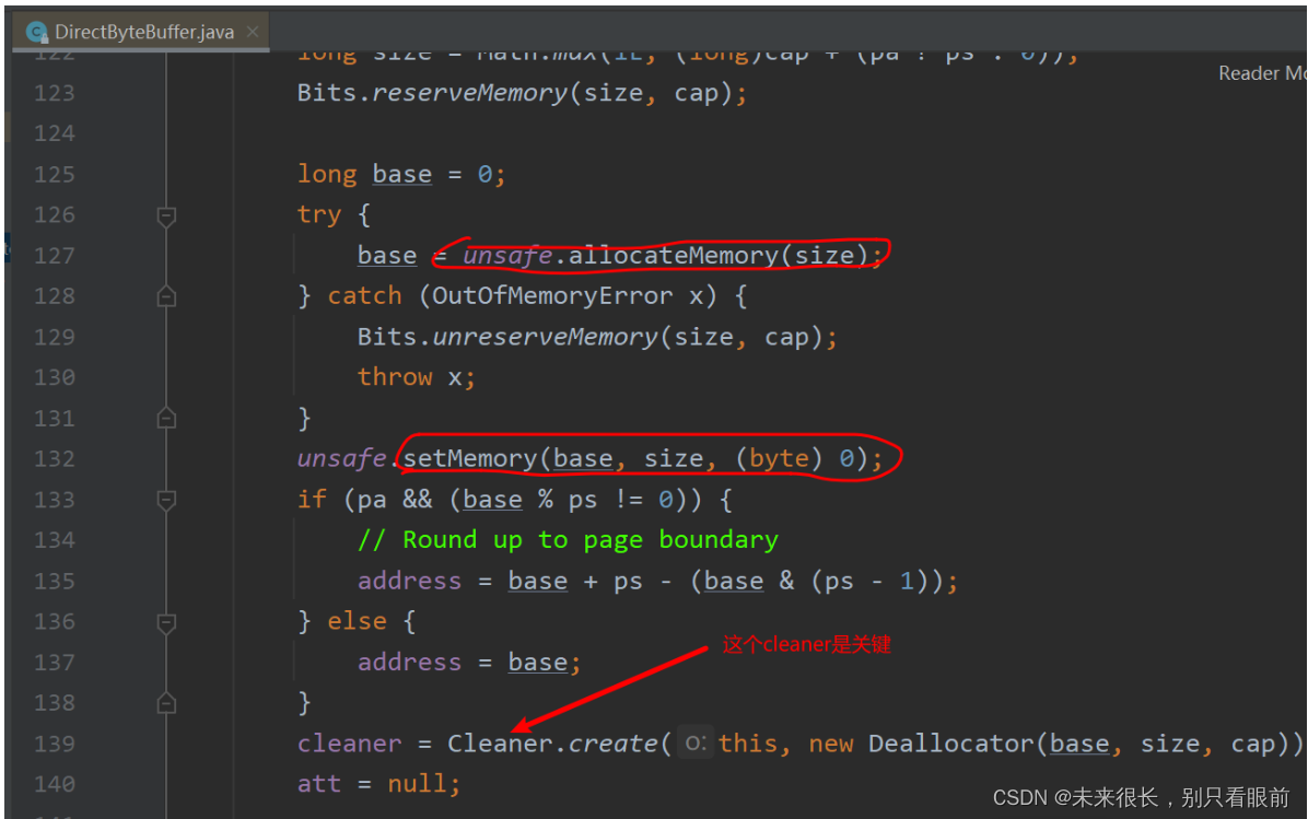 unsafe.freeMemory(base);了解是通过unsafe来释放直接内存后,再来看 allocateDirect()方法是怎么和Java中的unsafe联系的;