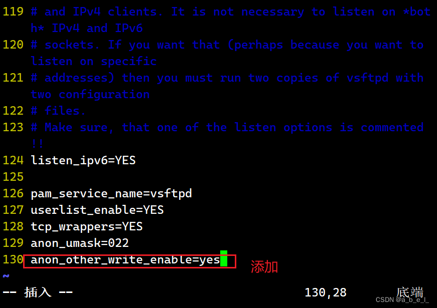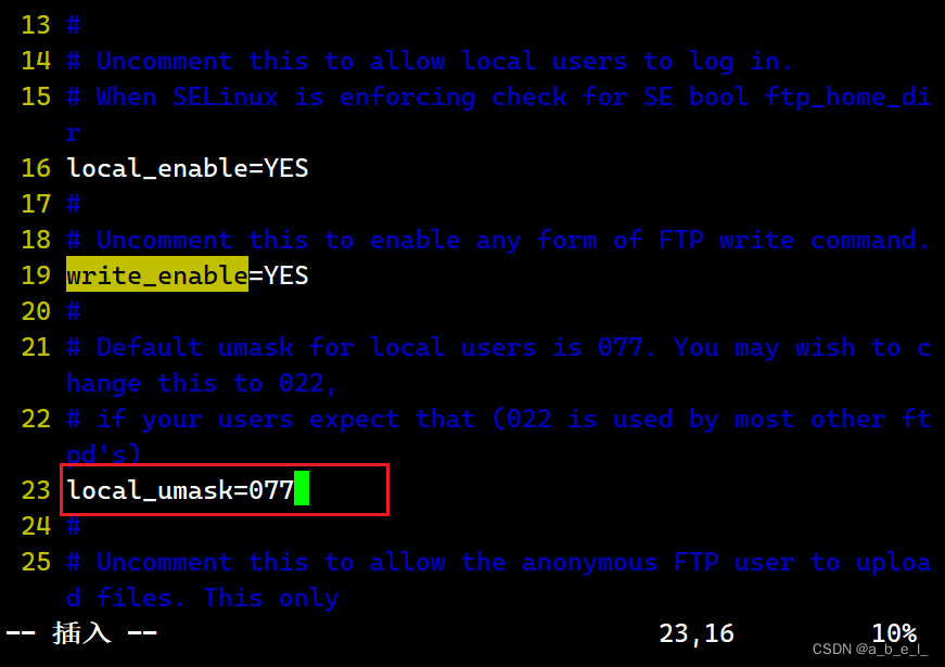 write_enable=YES # Open server write permissions ( To upload , Must be turned on ). The default is on anon_umask=022# Set the permission mask for anonymous users to upload data ( Unmask ).