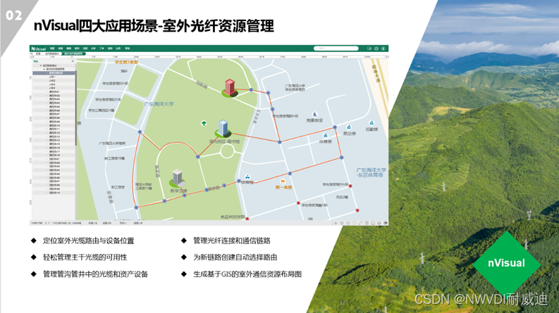 耐威迪 nVisual 网络可视化管理平台以数字孪生技术+管理模式创新为基础,追求资源可视化、管理精细化和运营高效化。通过建立核心的可视化记录数据库,对建筑综合布线、室外光纤资源、数据中心网络基础设施、自动化网络拓扑四大应用场景提供针对管理层的业务映射、针对运维层的查询分析和变更规划、针对实施层的工单派发和监测校验功能,可以将海量的通信系统等相关设备逐一纳入管理范围,实现真正的“所见即所得”。同时将传统管理方式重新定义为基于自动化流程驱动的变更,优化简化工作流,真正实现“降本增效”的运营目标。