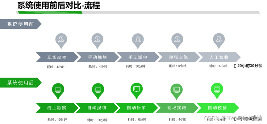 综上所述,通过部署 nVisual 网络可视化管理平台可有效解决当前高速网络运维管理中存在的诸般问题,明显提升管理效率和效果,并可节约大量的管理成本。实施统计数据和对比效果如下图所示: