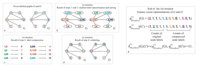 The principle is as shown in the figure :(a) For Graphs G And G’, Each of these nodes belongs to an element ( label ) There are five elements ;(b) The current node is represented by the label combination of its adjacent nodes ; Generate a new label ;(d) Represent nodes with new labels ; Iterating according to this logic . Finally, the feature vector in the right graph is generated to represent the graph G and G’. Color means label , The number indicates the number of times the label appears in the figure . When the representations of the two graphs are inconsistent , It is considered that the two graphs are heterogeneous .