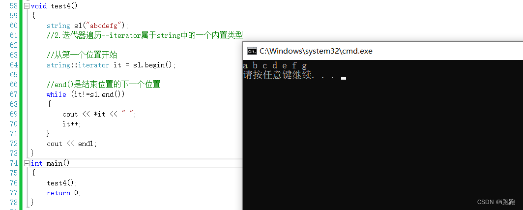 void test4() { string s1("abcdefg"); //2. Iterator traversal --iterator Belong to string A built-in type in // This method can be used to solve some problems with large number of combinations string::iterator it = s1.begin(); //end() Is the next position of the end position while (it!=s1.end()) { cout << *it << " "; it++; } cout << endl; }We're just getting started with iterators , It can be understood as a pointer first ,begin() Point to the first character ,end() Points to the next... Of the last character , Generally point to '\0', The next step is to operate in pointer mode .