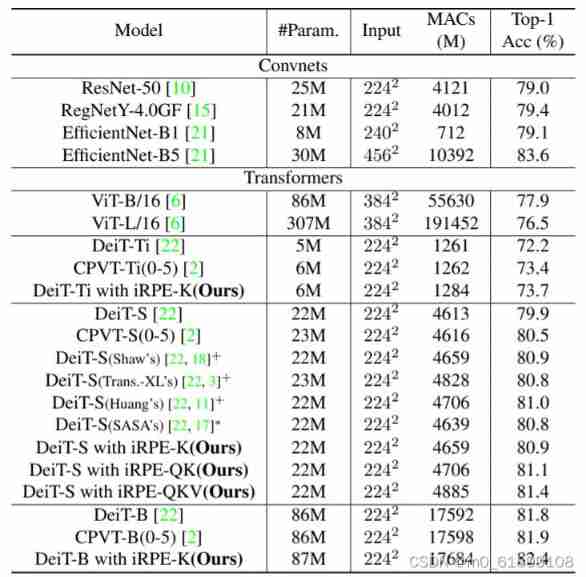 3. Consider efficiency and versatility , Four new vision transformer Relative position coding method , be called image RPE(IRPE). These methods are simple , You can easily insert self-attention layer . Experiments show that , Without adjusting any super parameters and settings , The method in ImageNet and COCO Compared with its original model DeiTS and DETR-ResNet50 Improved 1.5%(top-1ACC) and 1.3%(MAP).