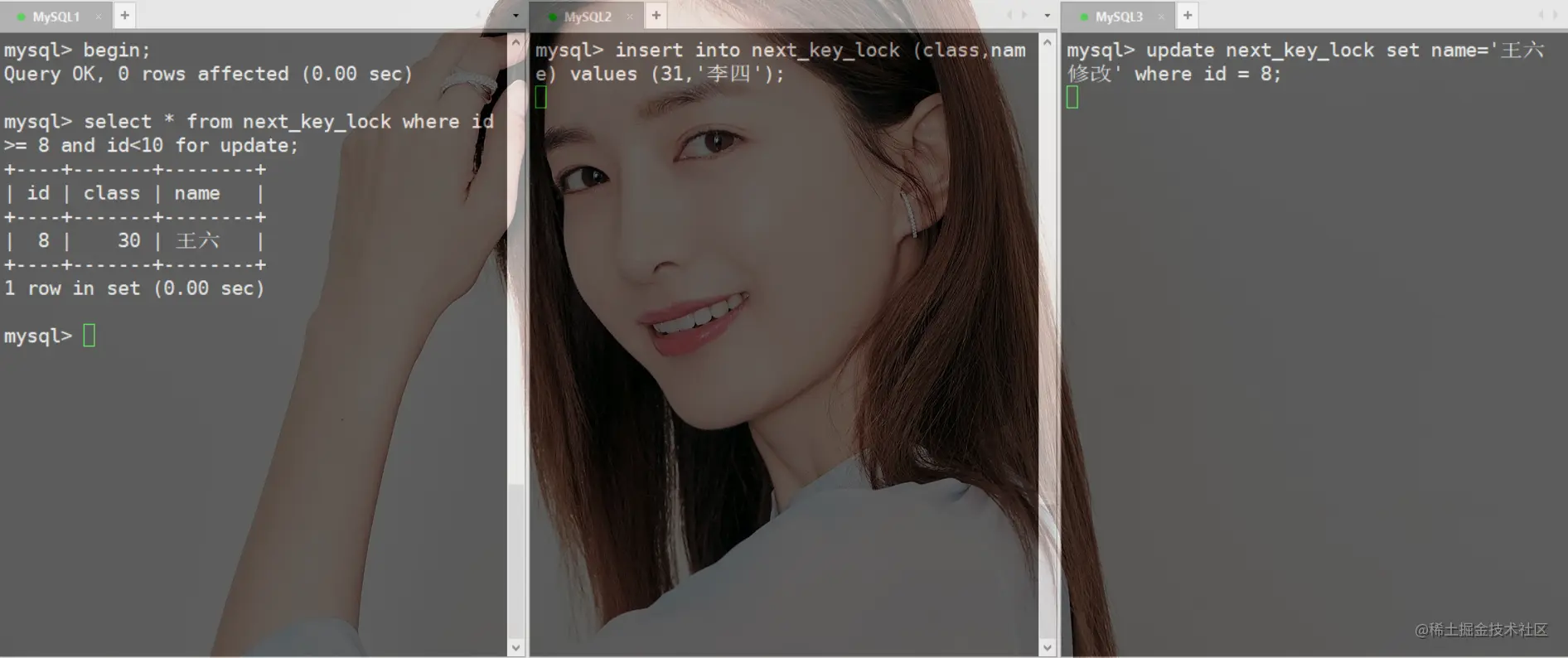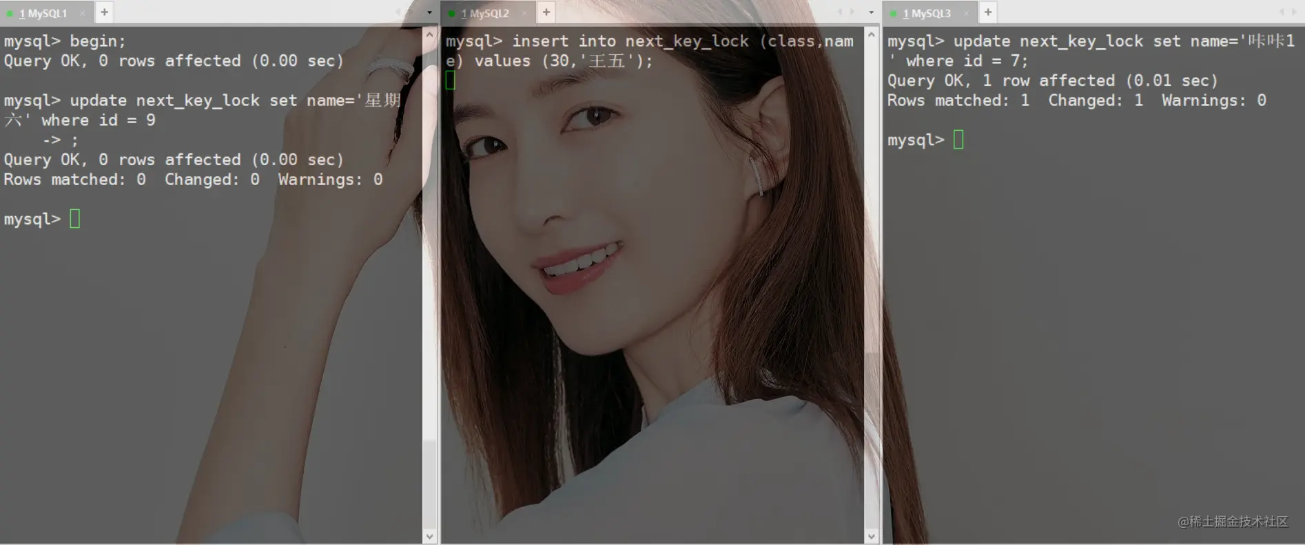 Three SQL After execution , What you see is MySQL2 Successful implementation ,MySQL3SQL wait for