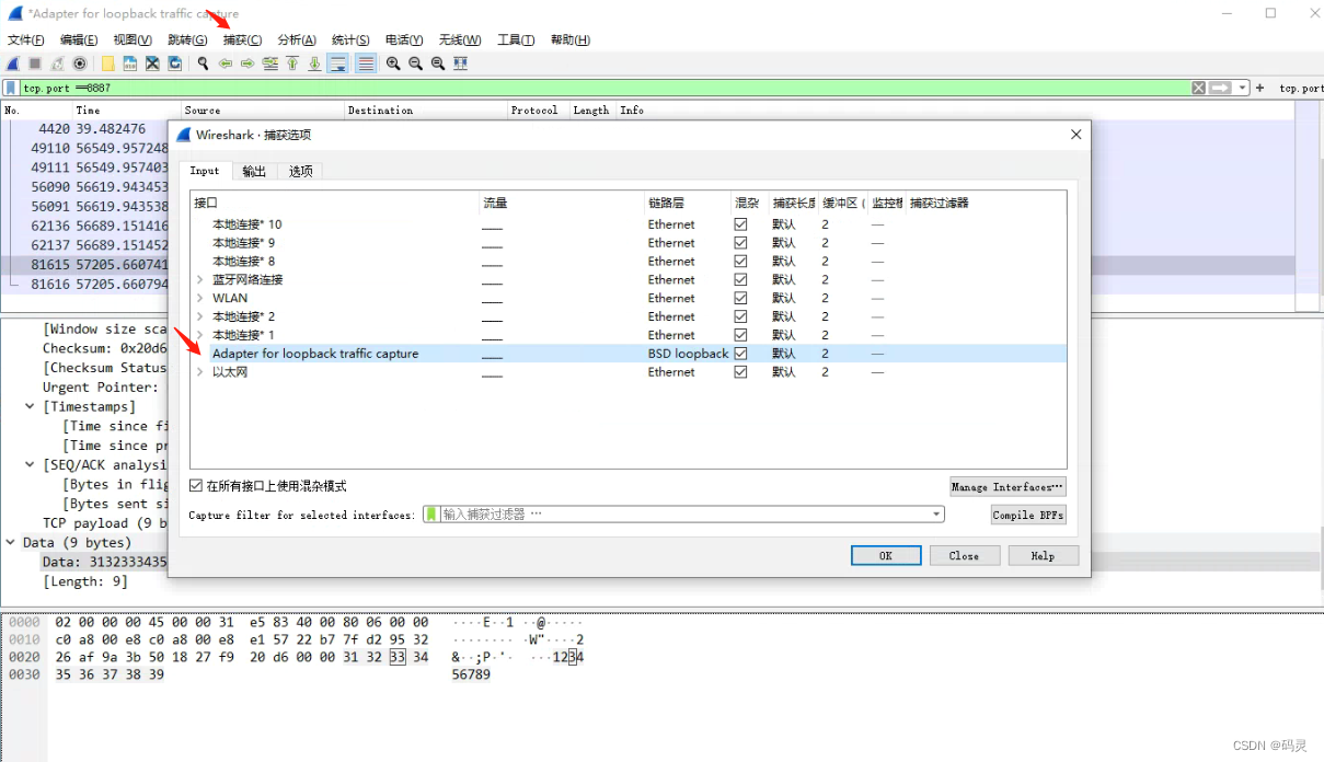 Capture the network Select interface Adapter for loopback traffic capture, As shown in the figure below