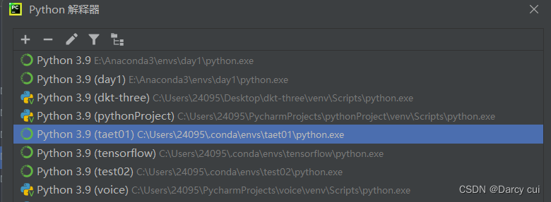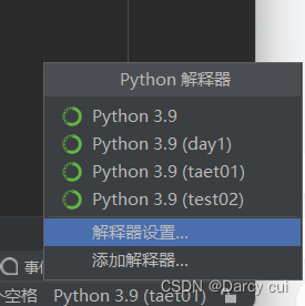 And then we can see The lower right corner python3.9(taet01) That is, the environment you created the project before , When we click, the following picture will appear , Select interpreter settings .