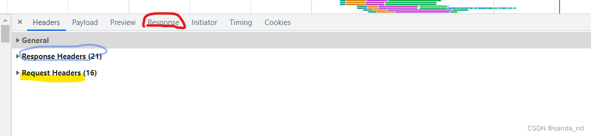 3、 蓝色标注为响应头,黄色标注为请求头,红色标注为响应体(由于为 GET 请求,因此没有请求体,POST 请求的请求体会在请求头的下面显示)