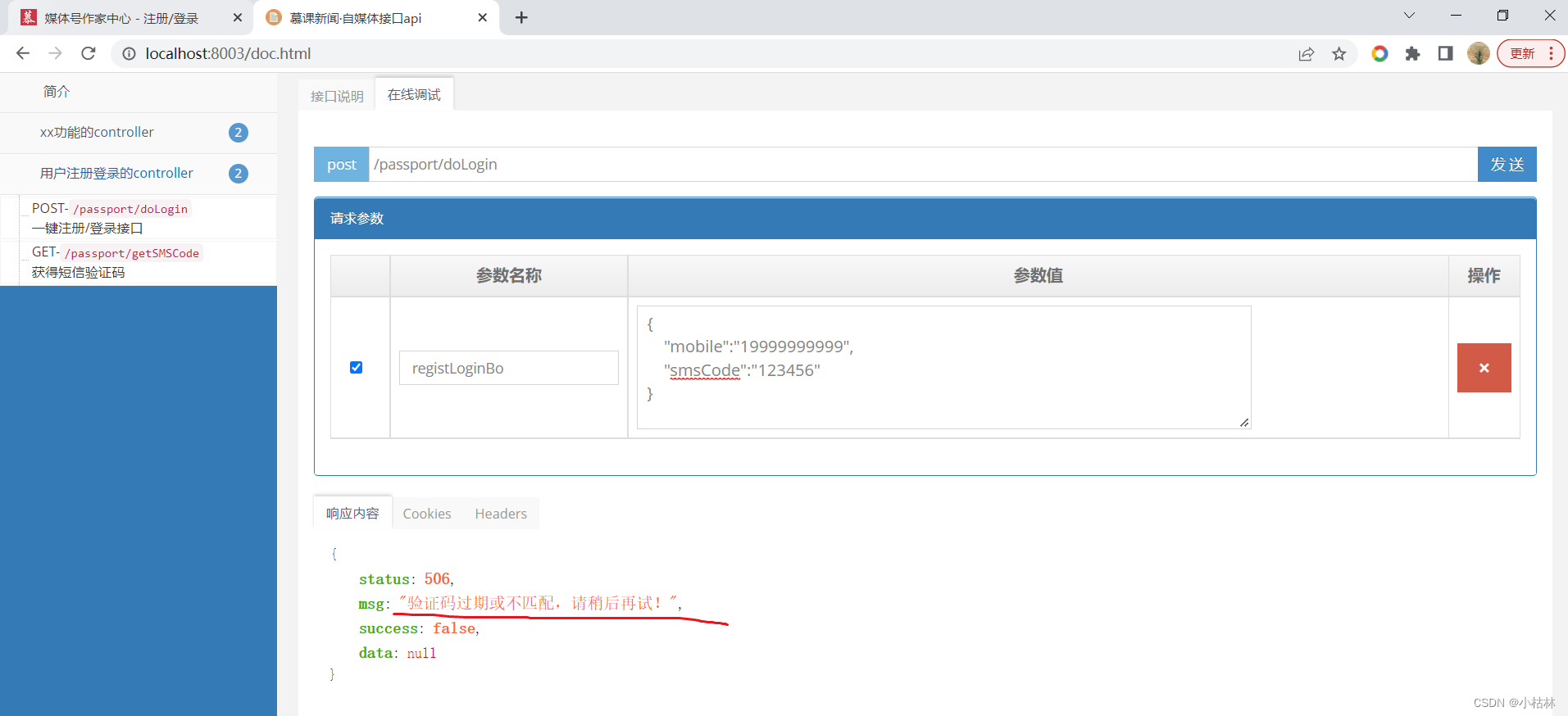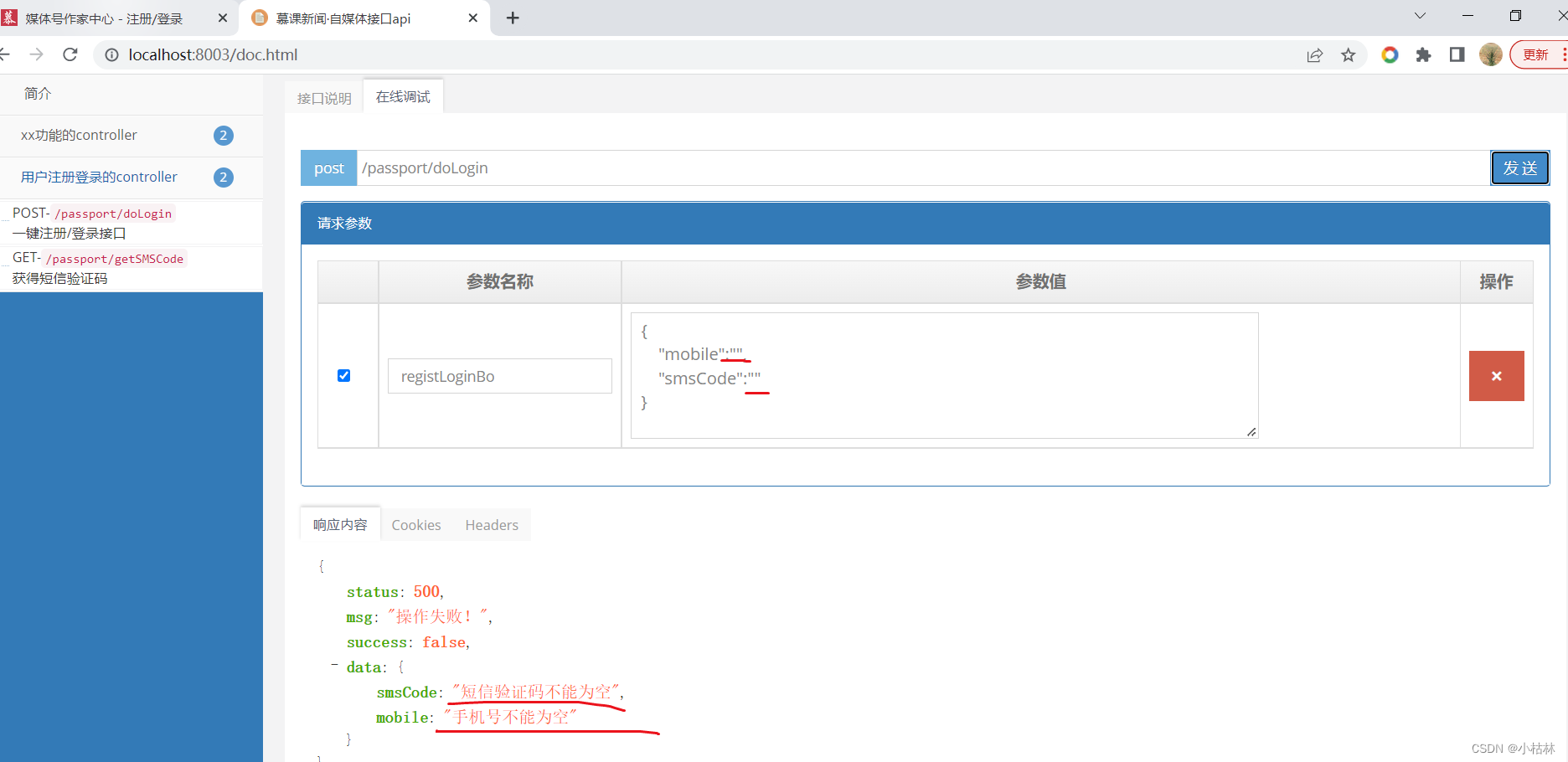 /** * 【 One click registration / Sign in , Interface 】 * @param registLoginBo * @param result * @return */ @ApiOperation(value = " One click registration / Login interface ", notes = " One click registration / Login interface ", httpMethod = "POST") // The request interface on the front end is already “getSMSCode” 了 , So I am writing back-end interface url When , Don't write ; @PostMapping("/doLogin") public GraceJSONResult doLogin(@RequestBody @Valid RegistLoginBo registLoginBo, BindingResult result);explain :