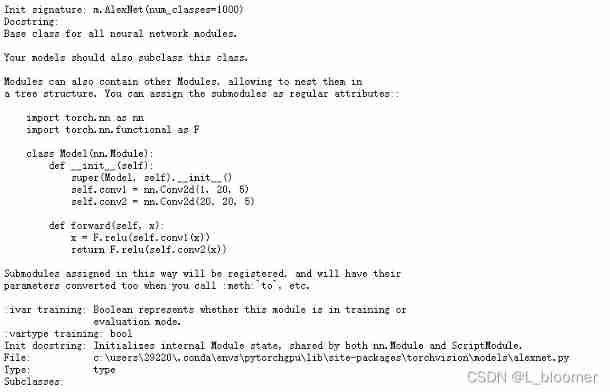 m.alexnet() # take AlexNet The functions of the parent class are included in , Parameter input to the original schema is not allowed , But you can do pre training