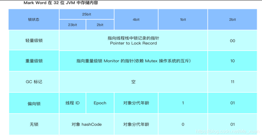 HotSpot虚拟机的对象头包括两部分信息,第一部分是“Mark Word”,用于存储对象自身的运行时数据, 如哈希码(HashCode)、GC分代年龄、锁状态标志、线程持有的锁、偏向线程ID、偏向时间戳等等,它是实现轻量级锁和偏向锁的关键。这部分数据的长度在32位和64位的虚拟机(暂不考虑开启压缩指针的场景)中分别为32个和64个Bits,官方称它为“MarkWord”。对象需要存储的运行时数据很多,其实已经超出了32、64位Bitmap结构所能记录的限度,但是对象头信息是与对象自身定义的数据无关的额 外存储成本,考虑到虚拟机的空间效率,Mark Word被设计成一个非固定的数据结构以便在极小的空间内存储尽量多的信息,它会根据对象的状态复用自己的存储空间。例如在32位的HotSpot虚拟机 中对象未被锁定的状态下,Mark Word的32个Bits空间中的25Bits用于存储对象哈希码(HashCode),4Bits用于存储对象分代年龄,2Bits用于存储锁标志位,1Bit固定为0,在其他状态(轻量级锁定、重量级锁定、GC标记、可偏向)下对象的存储内容如下表所示。