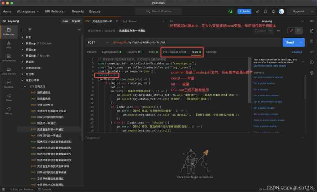 It is easy to use variables in a script ,get obtain ,set to update / newly added , I won't repeat it here . Need to pay attention to ,postman yes node.js Developed , The script is also js Script , So we need to have some js Basics . for example :response Get variables in ( from json Get the specified key Corresponding value); Type conversion ; Function writing and promise And so on .