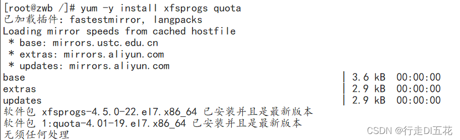 使用yum install -y xfsprogs quota 检测,如果程序没有安装,他会自动从yum公共仓下载安装,如果已安装则会自动检测更新。