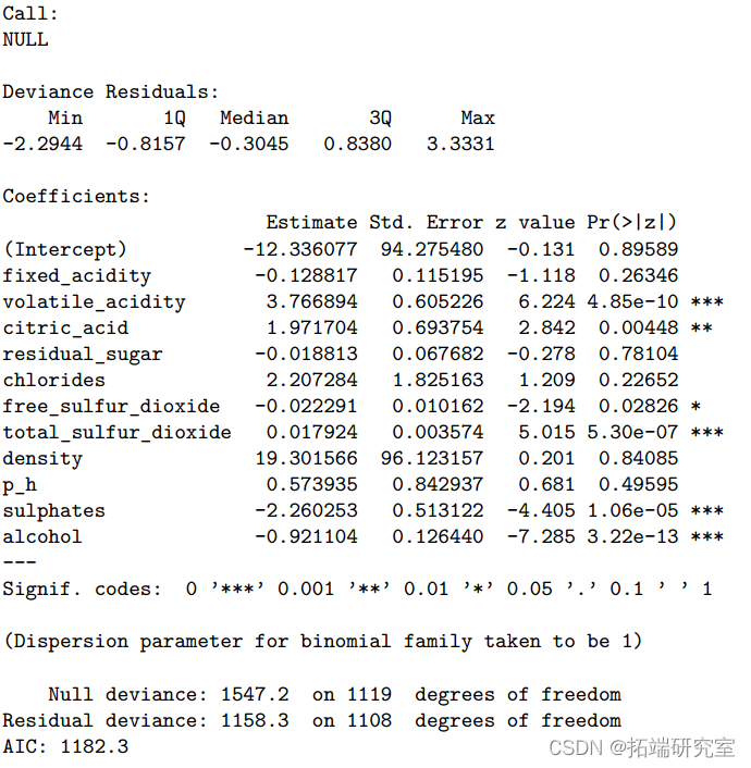 It turns out that , alcohol 、 Citric acid 、 Residual sugar 、 Sulfates 、 Fixed acidity 、 Volatile acidity 、 Chloride and total sulfur dioxide are significant predictors (P value <0.05).