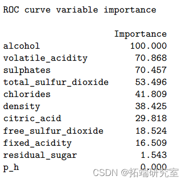 however , Because logistic regression requires little or no multicollinearity between independent variables , Therefore, the model may be subject to 11 Collinearity between the predicted variables ( If any ) Interference of . as for LDA, When applying models to test data ,ROC by 0.819, Accuracy rate is 0.762(95%CI:0.72-0.80). The most important variable to predict wine quality is alcohol content 、 Volatile acidity and sulfate . Compared with logistic regression model ,LDA Under the condition that normal assumptions are satisfied , It is more helpful when the sample size is small or the category separation is good .