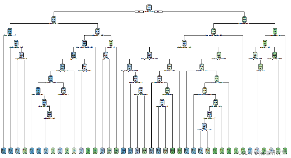 The model building process shows that , In the training dataset , alcohol 、 Sulfates 、 Volatile acidity 、 Total sulfur dioxide and density are the leading factors in wine quality classification 5 Important predictors . We chose the random forest model , Because of its AUC Value is the largest , The classification error rate is the lowest . The model also performs well in the test data set . therefore , This random forest model is an effective method for wine quality classification .