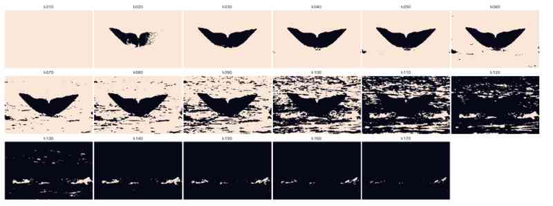 以下是使用10到170(十乘十)的所有值作为单个图片的阈值的结果示例。