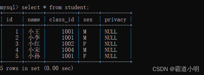 as select id,name ,class_id,sex from student;