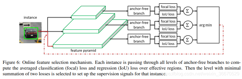 图6显示了我们的在线特性选择过程。首先将实例l通过所有层次的特征金字塔进行转发。然后利用式(1)计算所有无锚分支的