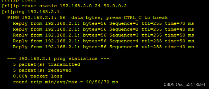 [r1]ip route-static 192.168.2.0 24 90.0.0.2