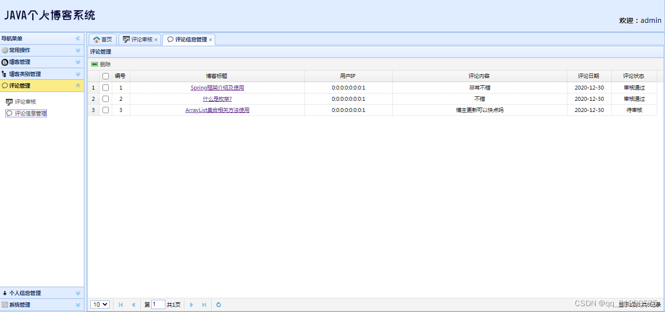 Comment information management module : The comment management function is divided into comment review and comment information management . Comment review is when a visitor or himself makes a comment , Bloggers need Review comments in the background management system . If you want to display this comment on the page, click approve , Otherwise, click "audit failed" .