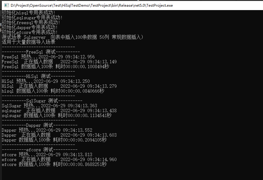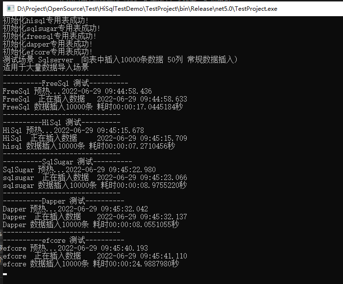 dapper efcore hisql sqlsugar freesql10 Insert the following general data into the test results