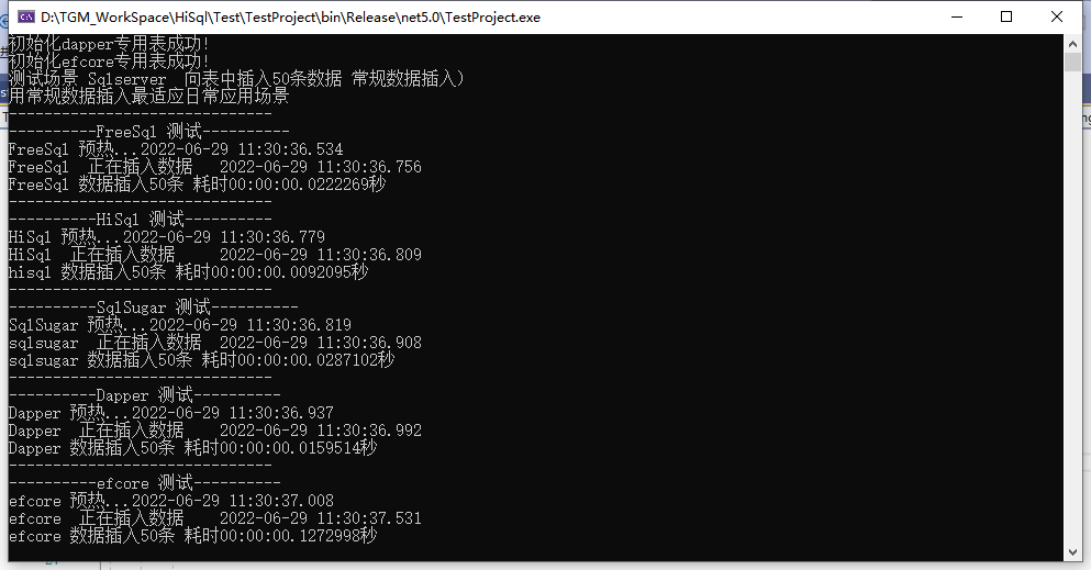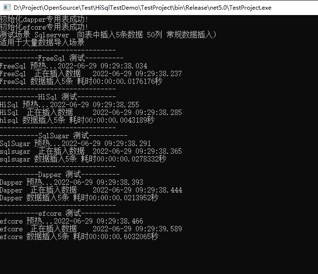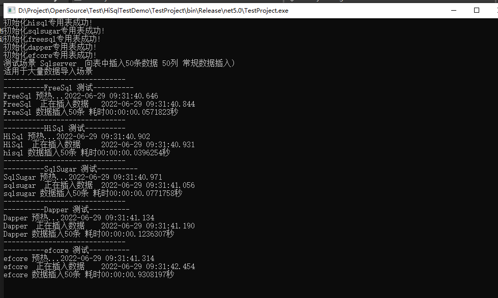 dapper efcore hisql sqlsugar freesql 50 Column general data insertion test results