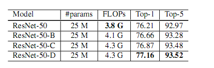 结果表明,与 ResNet50 相比,ResNet-B 在向下采样块的路径 A 中接收到更多信息,并将验证准确度提高约 0:5。将 7X 7 卷积替换为 3个 3X3 卷积,得到另一个 0.2 %改进。在下采样块的路径 B 中获取更多信息,提高了另一个 0.3 %的计算准确度。总共,ResNet-50-D 使 ResNet-50 提高 1%.