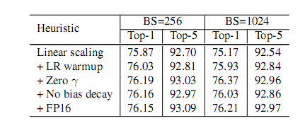 所有启发式算法的消融研究如表 4 所示。仅通过线性缩放学习率将批量从 256 增加至 1024,导致 top-1 精度降低 0.9,同时叠加了其余三种启发式算法,弥补了差距。在培训结束时从 FP32 切换到 FP16 不会影响准确性。