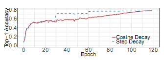图 3a 显示了阶跃衰减和余弦衰减之间的比较。可以看出,余弦衰减降低学习率缓慢的开始,然后成为几乎线性降低的中间,并在年底再次减慢。与阶跃衰减相比,余弦衰减从一开始就衰减了学习,但直到阶跃衰减使学习率降低了 10 倍,这可能改善了训练进程。