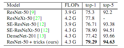 我们的经验评估表明,一些技巧可以显著提高精度,将它们结合在一起可以进一步提高模型的精度。在应用所有技巧后,我们将 ResNet-50 与表 1 中的其他相关网络进行了比较。请注意,这些技巧将 ImageNet 上的 ResNet50 stop-1 确认准确度从 75.3 提高到 79.29。它也优于其他更新和改进的网络体系结构,如 SE-ResNeXt-50。此外,我们的方法可以推广到其他网络(Inception V3 1 和 MobileNet 11)和数据集 (Place365 32)。我们进一步证明了用我们的技巧训练的模型在其他应用领域如对象检测和语义分割中带来更好的转移学习性能。