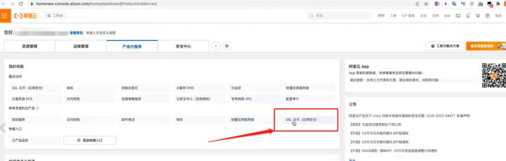 On the console page, click “ Products and services ” Options , And click “SSL certificate ( Application security )” term .