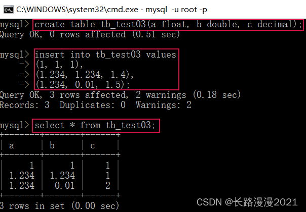说明:a和b的数据正确插入,而c被截断了,浮点数float、double如果不写精度和标度,则会按照实际显示。decimal不写精度和标度,小数点后面的会进行四舍五入,并且插入时会有警告!