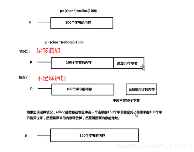 功能在原本申请好的堆区空间的基础上重新申请内存,新的空间大小为函数的第二个参数,如果原本申请好的空间后面不足以增加指定的大小,系统会重新找一个足够大的位置靠谱指定的空间,然后将原本空间的数据拷贝过来,然后释放原本的空间。