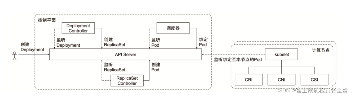 So pass create -f perhaps apply -f, Will this deployment Send to apiserver Went to the ,apiserver Be certified , authentication , admittance , When you're done, save the request to etcd It went to the , After storage, this time , The controller starts to work ,(control manager There are a lot of control Of ),deployment control The concern is deployment This object , He will analyze deployment object , Then use this template to create an application ,deployment The object that it will create the replica set is called replicaset,replicaset Is a replica set , That is to say deployment tell apiserver I created a replica set , There is an object in this replica set , Then what is the template like , This replica set is apiserver After accepting , Same result certification , authentication , Access control is stored in etcd Inside .