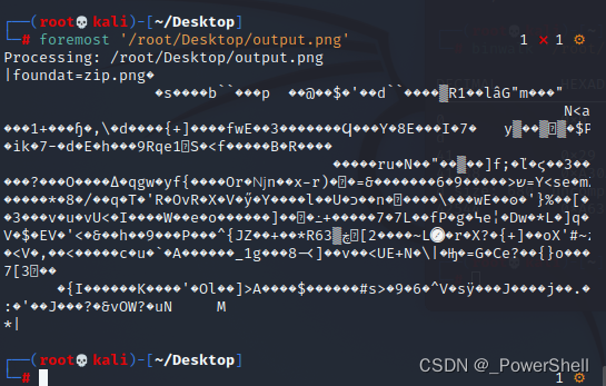 利用Linux下的foremost工具可以将output.png里隐藏的zip文件分离出来, 在kali linux命令行里输入foremost,然后将output.png拖入命令窗口回车执行即可分离,默认的输出文件夹为output,在这个文件夹中可以找到分离出的zip 。