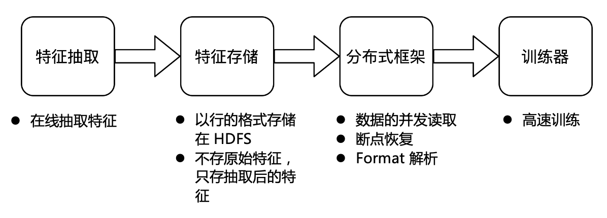 抽取后的特征以行的格式存储在 HDFS,考虑到成本,此时不存储原始特征,只存抽取后的特征;